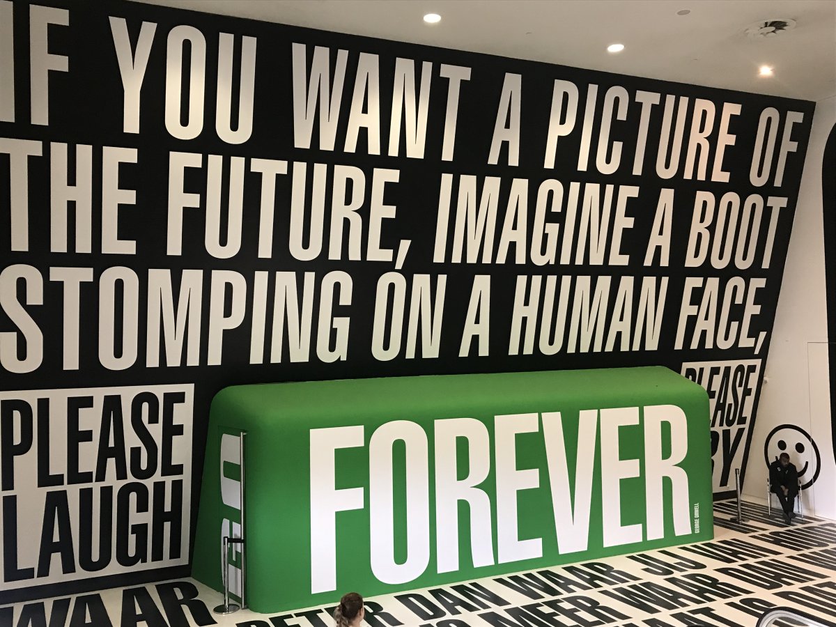 When on my lettering safari, I thought about not only font style, but how the typography is affective and impactful within it's environment. I like this piece from a gallery I visited, because the font is simple, the layout is ordinary - the words flow like a sentence from line to line across the wall - but the sheer size and scale of the words and letters makes people stop, stare and actually read the content. There is a man [bottom right] that heightens the scale of this work by artist Barbara Kruger.