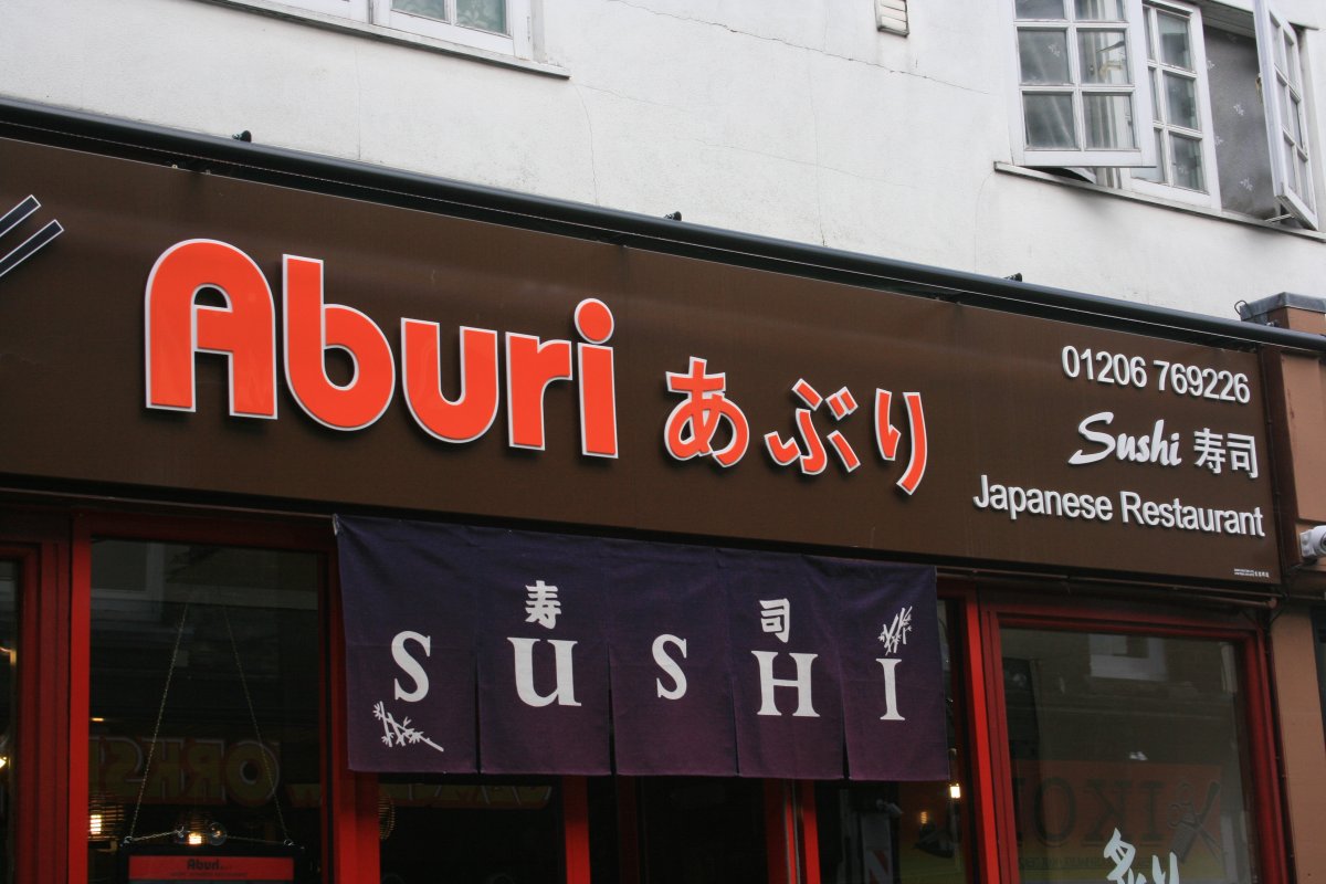 What stood out for me about this lettering above a restaurant is not only the use of 4 different styles of lettering on the signage, but also the different use of colour and also script/language. Notably, the hanging fabric with "sushi" has the "s"s hung upside-down. Whether intentional or not, I feel that it adds charm to the humble style. I also like the way in which the orange "Aburi" is so curved and smooth it feels very 80s retro.