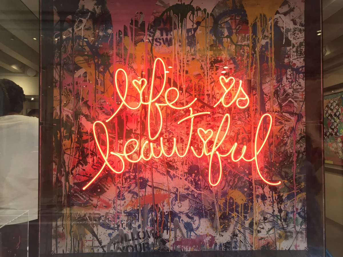 "Life is beautiful" is presented in a much more elegant, stylised and typically graceful way here. The continuous writing is practical because of the use of lights, but also reinforces the positive, uplifting message displayed. I like the way the lights are set against a busy background, making the single colour of the bright light stand out even more. Also the use of red neon is affective, and connotes with love, lending to the use of love hearts as the tittle of the "I", which is a much more decorative and elaborate use of lettering.
