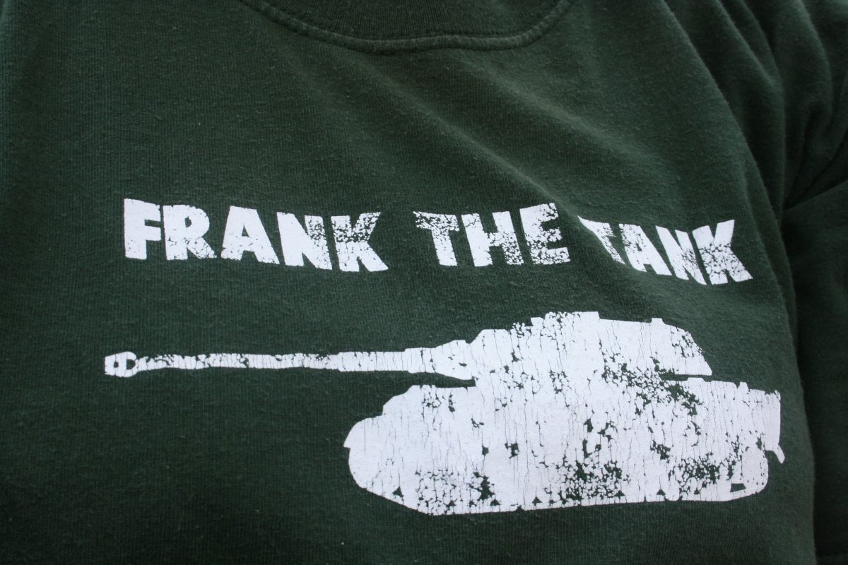 "Frank the tank" appears here in a style of lettering that resembles stencilled or stamped, lending to the military aesthetic of the top. The green t-shirt contrasts the white writing, with the colouring further enhancing the army vibes.
