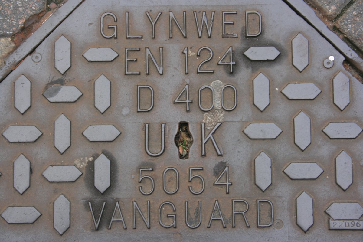 Raised and embossed lettering not only stands out physically, but adds textures that blend with those already there, especially as this drain cover in on the ground. I like the simplicity of this lettering: basic capitals, yet doesn't draw your attention to the ground. The lettering is highly functional.
