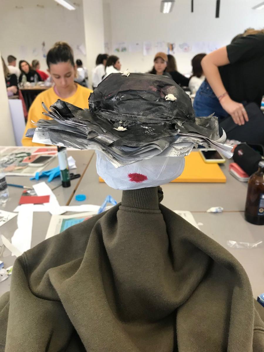 The final set visualisation task before independently completing the project was to produce a sculpture/model that represented our idea or product as best as possible. My hat made of hair is shown in the photographs above. Use of materials was limited, and so the visualisation is not as good as it could have been, had I used other media such as fabric, felt, or actual hair. However, in order to reflect my idea in action, I added small "nits" made of clay to the hat, just as they would be if the product were real and in practical use. Although this alters the dymentions of the piece as it is not to scale, I felt it had potential to show people what, in theory, the hat would be for, in everyday life. By withholding facial features from the figure head, I wanted to lend to the futuristic idea of a dystopian society, where identities are lost and compromised.