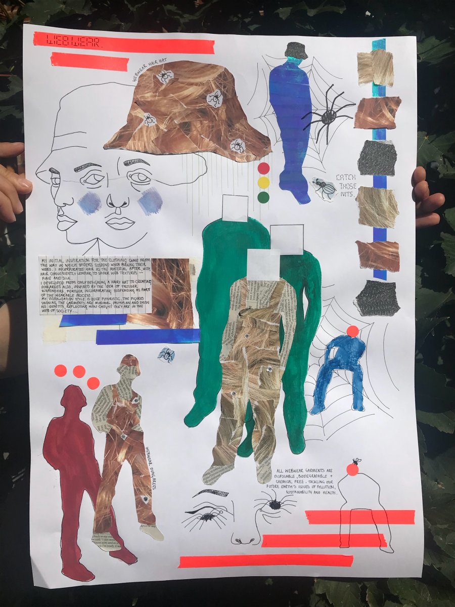 By keeping the background of my piece white, with bold coloured silhouettes highlighting the garments, I think it drew attention to the fact that my idea is made for people to use and make a statement with. I drew abstractly to somewhat reflect the hat in action, especially with the conjoined face [top left] emphasising the scale and practicality of the hat. By drawing/painting figures with dungarees and hats collaged ontop, scale is further presented, as well as, in theory, how the products would be worn and styled. I think my use of media is appropriate, however if I wanted to give my work more of an edge, or a bolder statement, I could have used more of a textiles media to reflect the materiality of hair more accurately. This is something I will consider in future projects - visualisation should not be restricted by materiality, whether 2d or 3d. By placing my figures in a minimal surrounding, I wanted to reflect my views of the future - a clean, almost empty enviroment, digitally futuristic and dystopian. I purposefully gave my figures no faces to reinforce this idea of dystopian society, in which identity is compromised for the price of technological advancements. Through this, in hand with the underlying influence of my allocated process - suspend - I hope I have communicated my idea clearly.