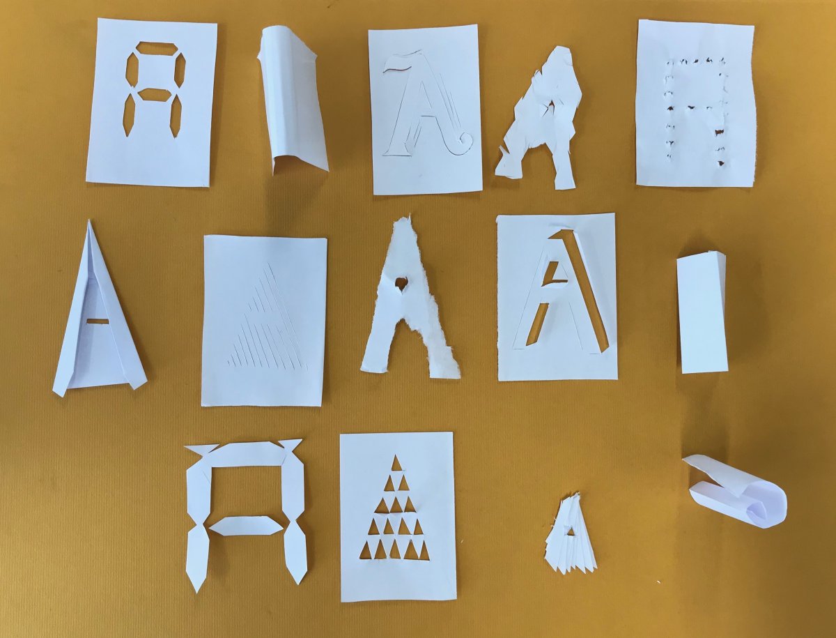 Below are my quick fired fonts. With a short amount of time to come up with as many different designs as possible using methods of only cutting, folding or tearing, I found it challenging to instinctively come up with ways to create the letter "A". Personally, I feel I panicked under the time restrictions, drawing me closer to a conventional letter - a few of my attempts are so much like fonts that already exist - and had I more time, I believe I could've been a bit more ambitious and abstract.