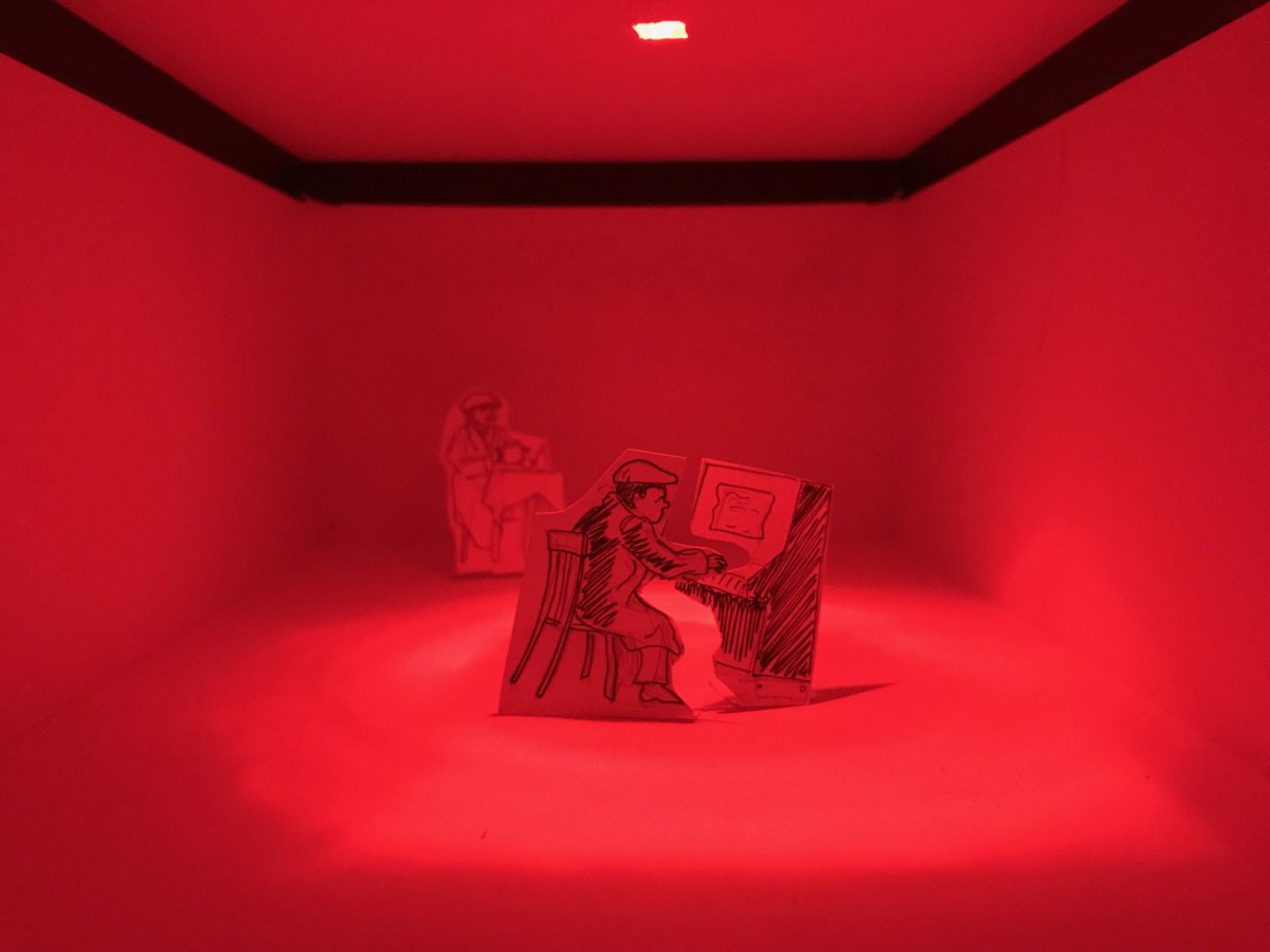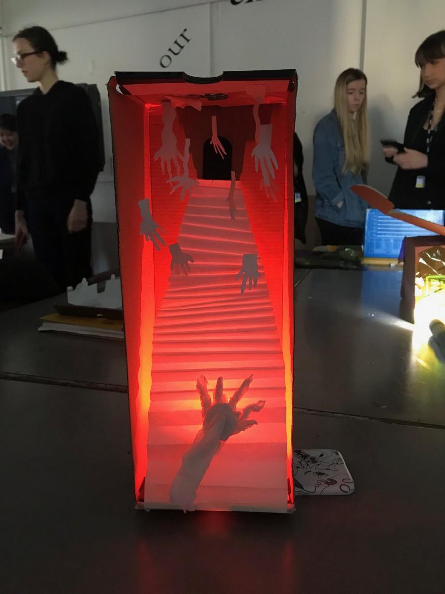 From my experimentation, I found that coloured lights and acetate gels can be used to enhance an atmosphere or narrative, if and when the colours are matched appropriately. For example, red lights in a dark, haunted narrative situation, because the colour connotes with danger, and would create an ominous atmosphere. I saw a great example of how colour and light can be used to create and change an atmosphere when looking around at peer work. A classmate [other students' work 1] built up a scene using only black and white illustrations, and made the piece interactive by having an option for the viewer to alternate between red or blue lights through changing the position of the torch on the structure of the box. In doing this, it was interesting to see how the same scene felt so different in the different coloured lights. In my experimentation I also learned that light from above differs greatly to light from the side or bottom, in terms of atmosphere.