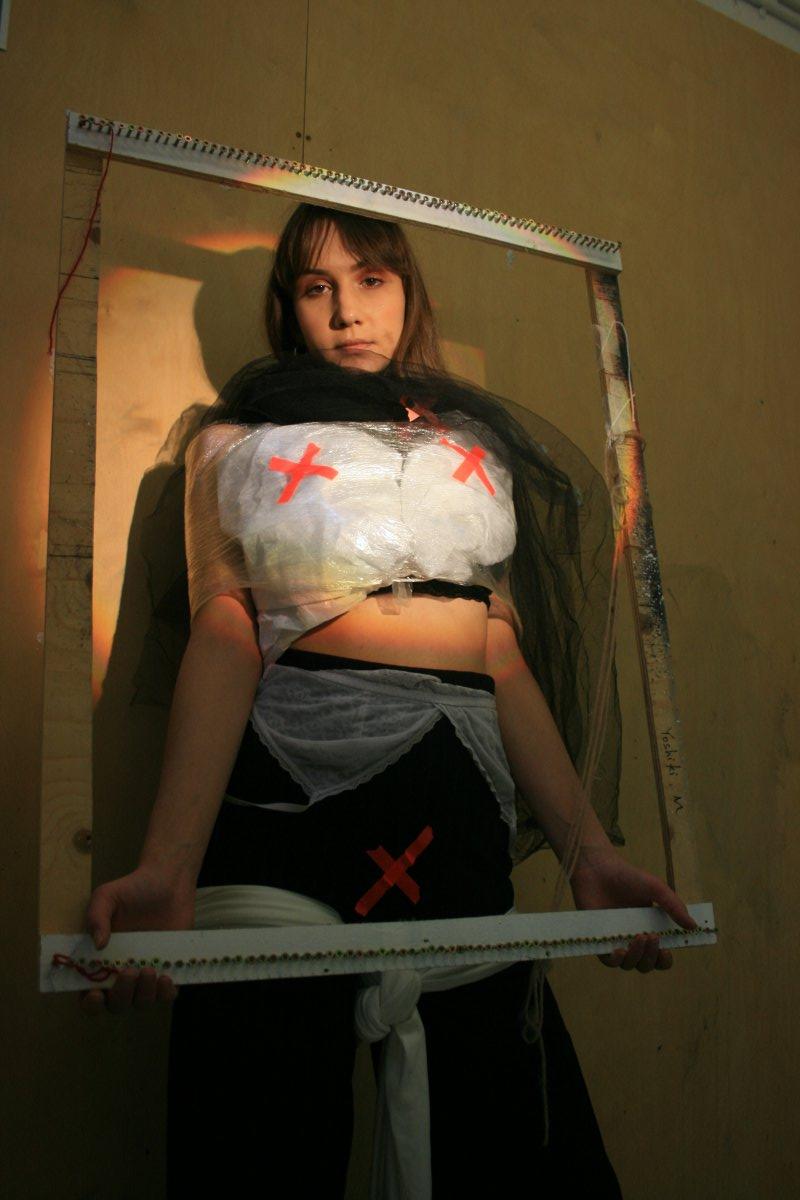 - My interpretation of graphic went down the path of "pornographic", in hand with Hanna's word, shapely, leading to shaping body parts, more specifically sexual organs, out of stiff material and cling film. I used red tape to create x's on the padded breasts and private parts, to draw on the pornographic aspect of the style. Incorporating lingerie as part of the outfit, but as a belt type piece rather than its intended purpose, furthers this idea of shaping the body in a graphic way.
