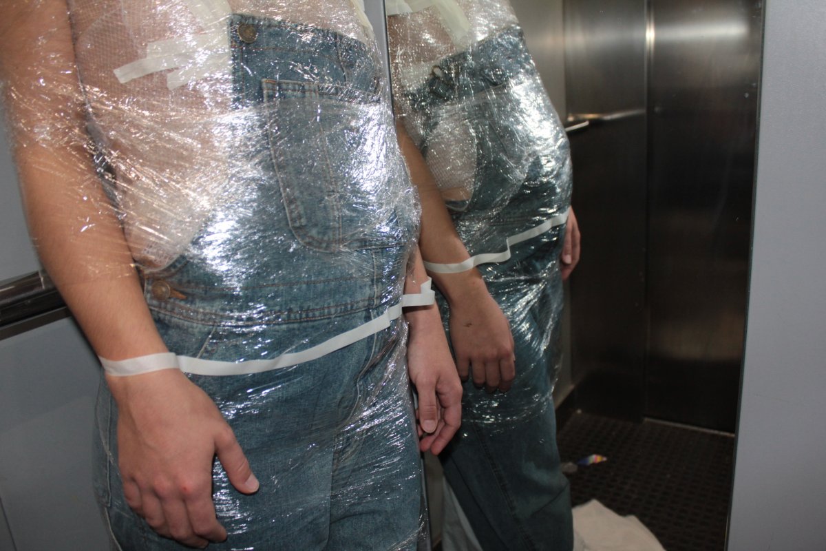 - The oversized nature of the large denim dungarees, contradicted by the tight wrapping of the clingfilm (which is also transparent) is what makes up this piece, and draws it to the keywords we associated it with. I like the way that we chose to photograph inside the college lift, where the large, full length mirror allows the look to be captured in a reflective, almost 360 view. I wish we took more photographs of this style in the studio setting, capturing it in a full frame, full body length composition.