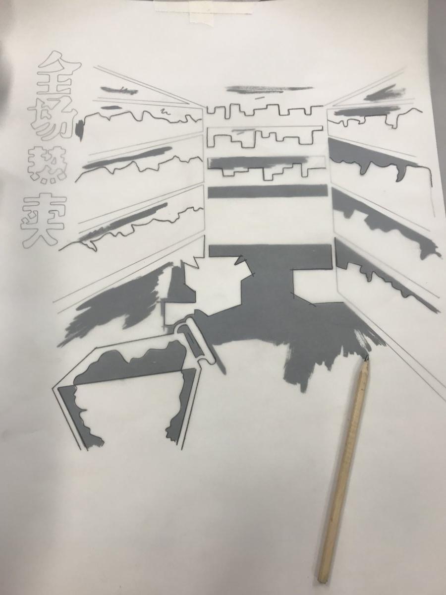 After the speedy shape task, I took it upon myself to refine my design for the relief plate. I thought about the composition, and what parts of the three sketches to include, and where. I thought the typography worked best vertically, down the side of the image, as it still made sense, however only added to the context, rather than distracting from the actual scene itself. I tried to make the shopping cart larger and in the foreground, adding to the illusion of depth created by the isle of shelves going into the distance. At first, I chose to just illustrate the structure of the shelves, however afterwards, I thought that looked too basic, and so added the detail of the silhouettes of packaging and products onto them. In reflection to that, I considered that maybe this was also too simple, however in regards to the carving of the relief plate, adding words and small illustrations to the packaging would have been too difficult to do successfully at this stage, and so I focused on creating effective dimensions and scale in the isle. I have, however, used a draft design on the print on paper to show how I imagined the print to look, had I included more detail (and looking at that, it is clear how intricate my knife skills would have to be to pull off such small features).