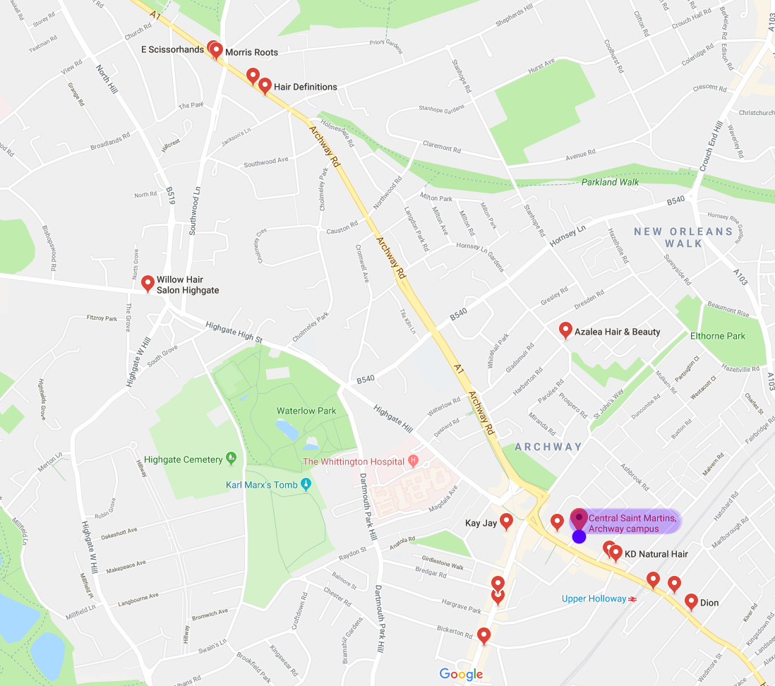 As previously mentioned, it is much more sustainable to use hair than fur, as it grows back naturally. However, how could I – hypothetically – get enough hair to make my intended products? First and foremost, donations sites and hair donors could voluntarily give their hair, whether it be from their brushes or after a haircut. This led me to consider how much hair is thrown away into landfill from hairdressers. I looked into how many hairdressers are in the near radius of CSM archway campus, alone, and there are several as shown in the image. If hairdressers were willing to hygienically keep the hair they cut for the purpose of “webwear” garments, not only would there be enough hair to make a constant flow of products, but the whole process would be reducing landfill and positively contributing to the wellbeing of the planet – something to help conserve future earth.